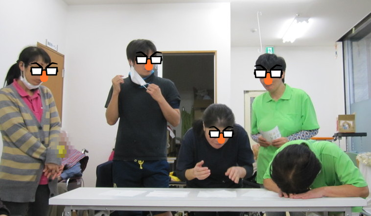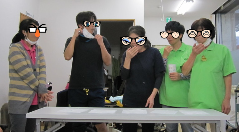 プチシューの中に大量の山葵を1つだけ入れ5人の職員に食べさせました。山葵を大量に入れていると、利用者様から「そぎゃん入れたら、かわいそか」と言われながら…いざ!!実食( *´艸`)